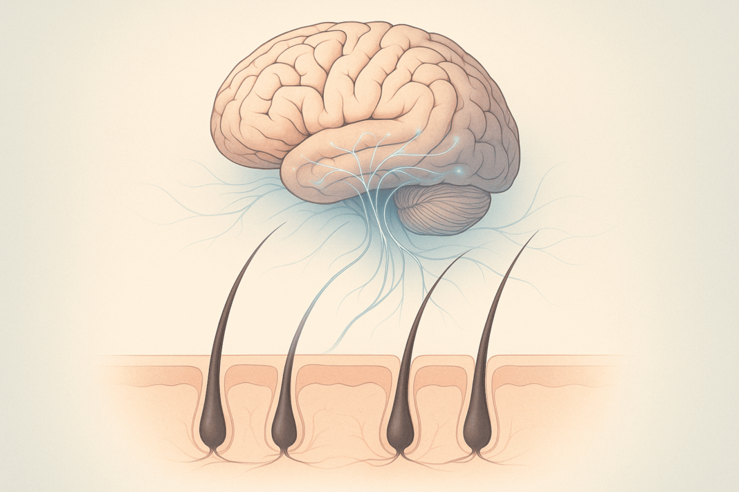 Tra i punti più rilevanti della sua relazione, la Dott.ssa Batacchi ha affrontato anche il tema della serotonina, un neurotrasmettitore che collega direttamente la mente alla fisiologia del follicolo pilifero. La serotonina, infatti, non regola soltanto il tono dell’umore, ma agisce anche a livello del cuoio capelluto, stimolando le cellule della papilla dermica e favorendo la crescita del capello. Una sua carenza può determinare alterazioni sia nel comportamento del follicolo sia nella percezione di dolore o fastidio cutaneo, fattori che spesso si ritrovano nei pazienti con stress cronico o depressione.