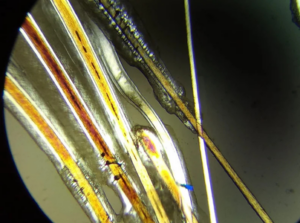 Analisi microscopica che evidenzia la presenza di depositi caustici di acido lattico attorno al fusto capillare, condizione che la formula brevettata Hilaria è in grado di disgregare.