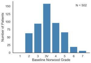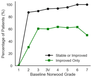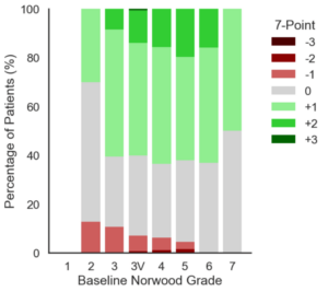 I grafici dello studio qui illustrato, sopra: partecipanti divisi per scala Norwood, sinistra: risultati divisi per scala Norwood, destra: variazioni della scala 7 Punti divisti per scala Norwood