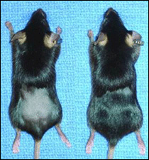Within 15 days, the transgenic mice grew new hair, whereas wild-type still had none (see accompanying image). Furthermore, the new hair was histologically indistinguishable from normal hair, and progressed through the remainder of the growth cycle in stereotypical fashion. |