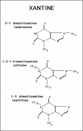 Dal punto di vista medico tre sono le xantine più importanti: la teofillina, la teobromina e la caffeina. Si tratta di tre alcaloidi con costituzione chimica simile ampiamente distribuiti nel mondo vegetale. La caffeina si trova nei frutti della “coffea arabica” e specie similari dalle quali si ricava il caffè; la teobromina è contenuta nei semi di “teobroma cacao” con i quali si ottiene il cacao ed il cioccolato; la teofillina e la caffeina si trovano nelle foglie di “thea sinensis” da cui si ricava il tè. La caffeina, la teofillina e la teobromina sono xantine metilate e vengono spesso denominate metilxantine. La caffeina è 1,3,7 trimetil-xantina; la teofillina è 1,3 dimetil-xantina; la teobromina è una 3,7 dimetil-xantina.